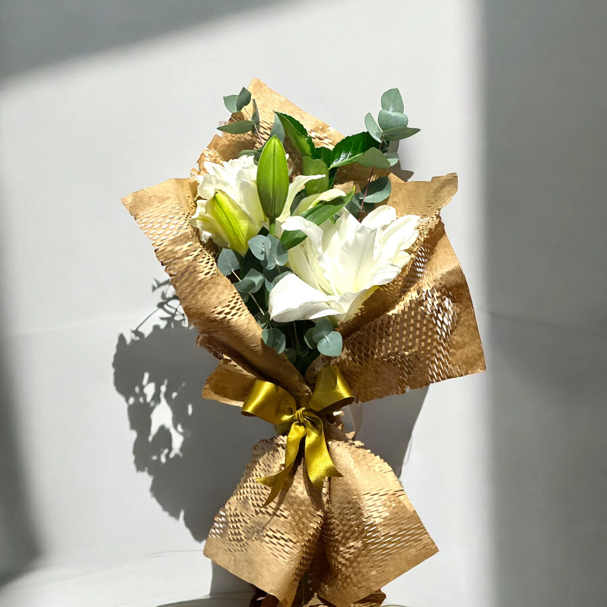 Este buquê deslumbrante de lírios brancos, complementado com folhas de eucalipto e um laço dourado, simboliza pureza e sofisticação. Perfeito para ocasiões especiais, transmitindo serenidade e beleza atemporal.